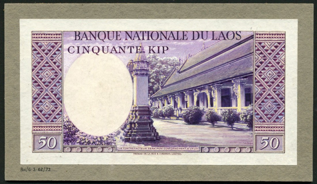 (†) Banque Nationale du Laos, a reverse composite essay on card for a 50 Kip, ND (1963), purple, pale blue, brown and pale yellow, cloisters at Wat Sisaket, Vientiane at right, stone monument at centre