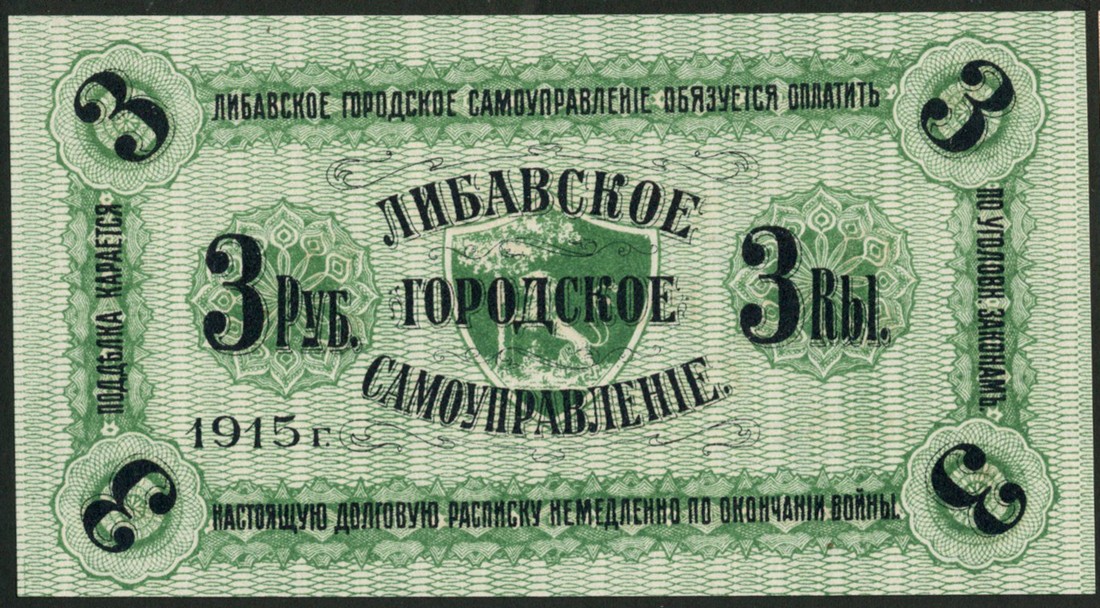 Libau/Libava (Emergency under Baltic Occupation), 10 kopek, 1, 1, 1, 3 ruble, (Ryabchenko 22014a, 22017, 22026, series B, 22026 joined pair series A, 22027 without series, all 1915