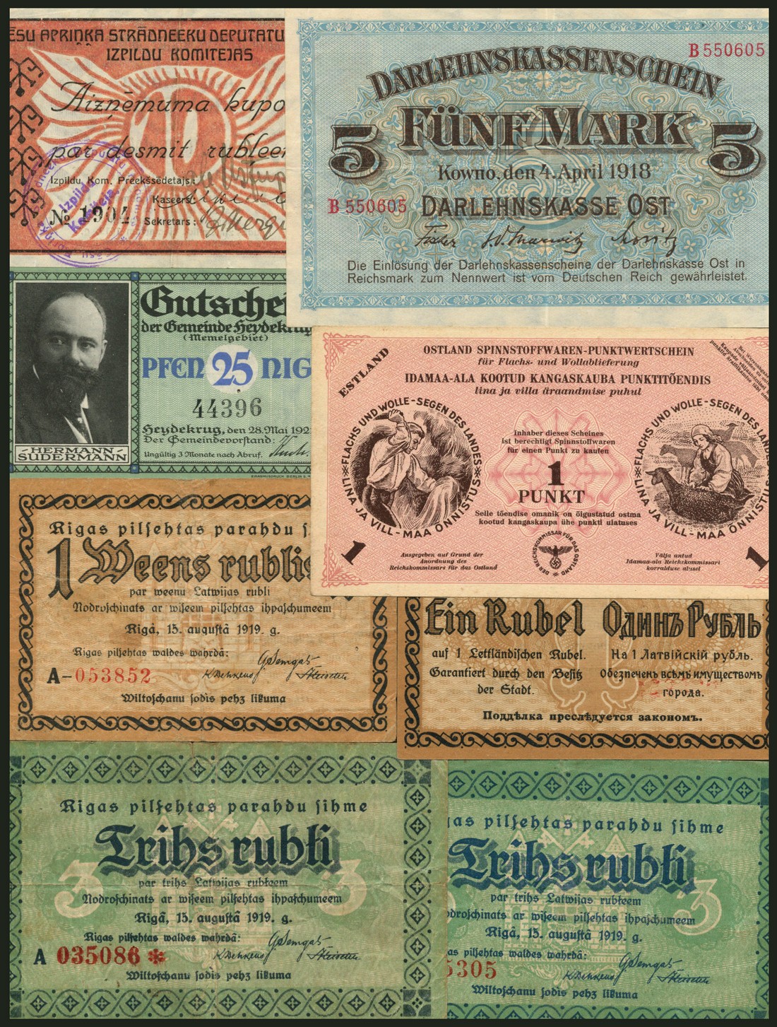 Riga, Cesis, Memel, 5 mark (Kowno) 1918, 1, 3 ruble (Riga (2 each)), 1919, 10 ruble, 15 March 1919 (Cesis), 25 pfennig, 1021, (Heydeknig), also, 1 Punkt Estaland Cotton Manufacture 1925, all different
