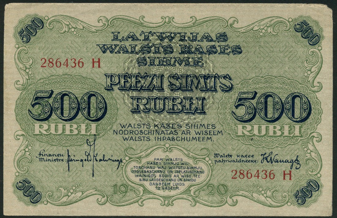 Republic of Latvia, 500 rubli, 1920, serial number 286436 prefix H, green, red serial number