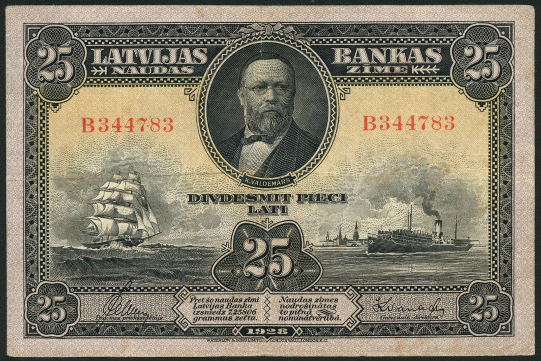 Bank of Latvia, 25 latu, 1928, serial number B344783, slate gey on yellow, 25 latu, 1938, serial number B779,596, green