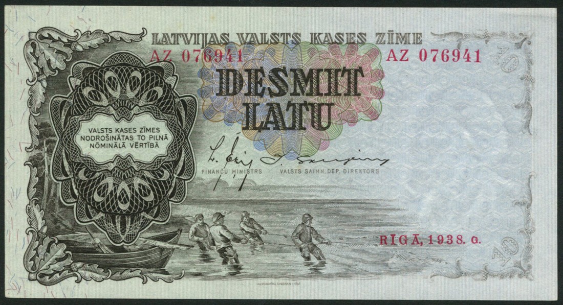 Latvian State Treasury, 10 latu (4), 1937, 1938, 1939, 1940, three signature varieties, black and grey on multicolour, boat at left, fishermen centre left, reverse, farmer sowing crops