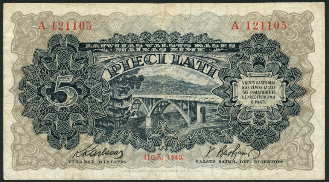 Latvian Government Exchange Note, 5 lati (3), 1940, serial numbers A121105, B068510 and C127096, dark blue on grey mauve underprint
