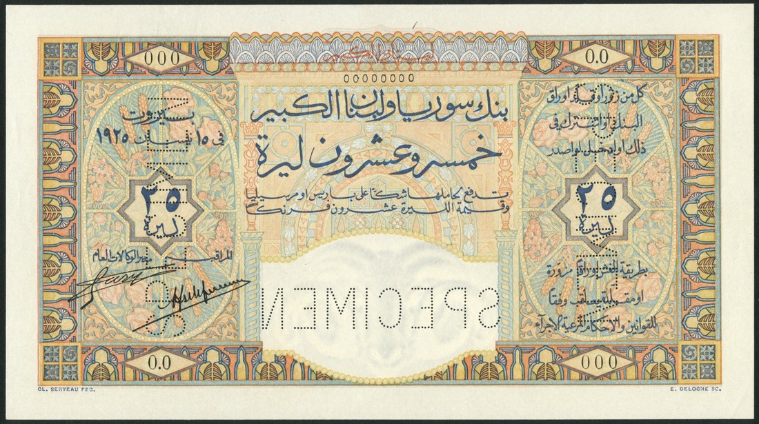(x) Banque de Syrie et du Grand-Liban, Lebanon, specimen 25 livres, 1925, serial number 0.0-000, blue and multicoloured, archway and columns and ornate background detail, printed signatures of Forges and Laferriere at left, reverse blue and multicoloured, GRAND-LIBAN in dark red top centre, below in blue title BANQUE DE SYRIE ET DU GRAND-LIBAN, a view of 'Krak de Chevaliers' at centre