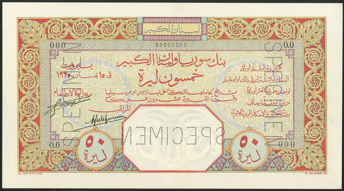 Banque de Syrie et du Grand-Liban, Lebanon, specimen 50 livres, 15 April 1925, zero serial numbers, red and multicoloured, ornate background detail, Forges and Laferriere signatures, reverse blue, red and multicoloured, courtyard and houses at centre, blue GRAND-LIBAN top centre
