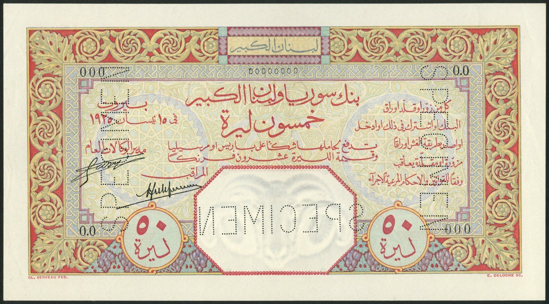 (x) Banque de Syrie et du Grand-Liban, Lebanon, specimen 50 livres, 15 April 1925, zero serial numbers, multicolour, ornate designs and borders, reverse buildings, perforated SPECIMEN