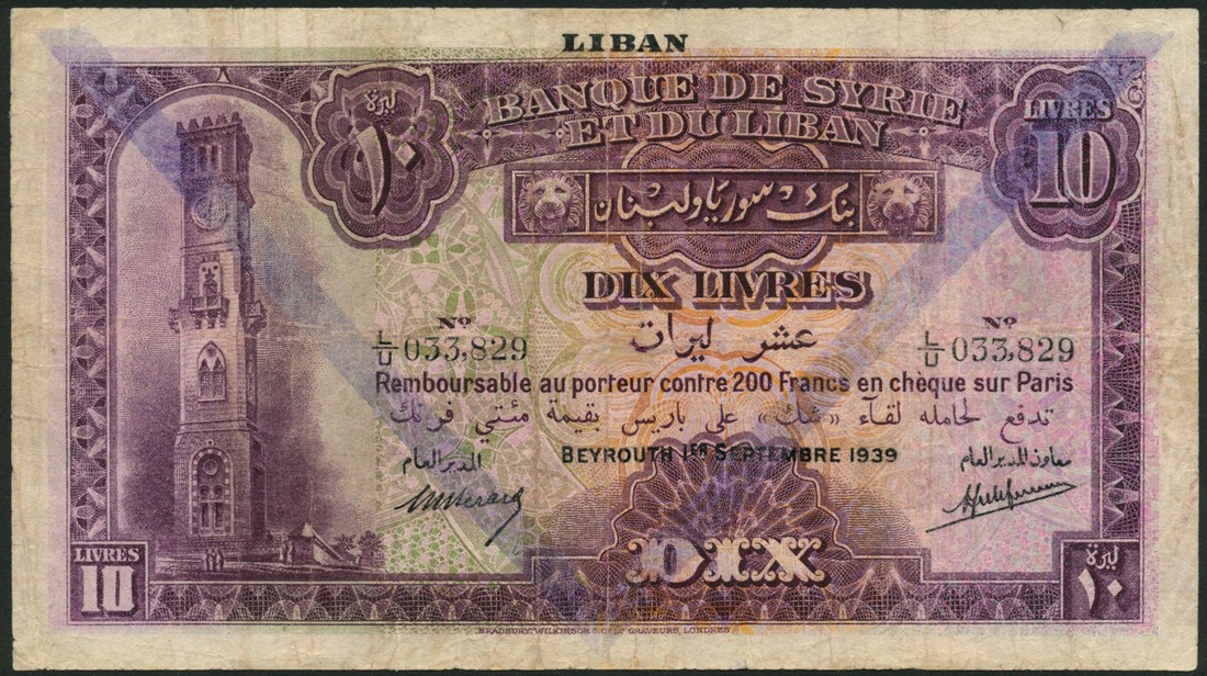 Banque de Syrie et du Liban, Lebanon, 10 livres, 1939, serial numbers L/U 033829, purple and multicoloured, clock tower at left, blue chevron at centre, Berard and Laferriere signatures, reverse pink-red, dhow in oval frame at centre