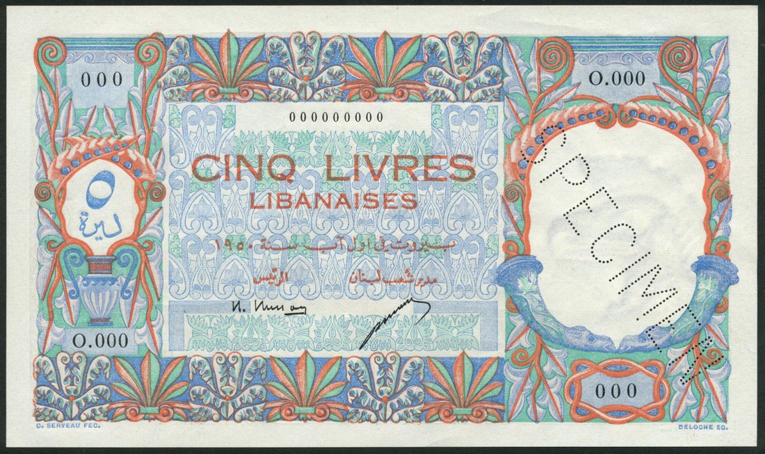Banque de Syrie et du Grand-Liban, Lebanon, specimen 5 livres, 1950, zero serial numbers, pale blue and multicoloured, ornate background detail, drinking horns at right, Busson and Letayf signatures, reverse blue and multicoloured, roof tops