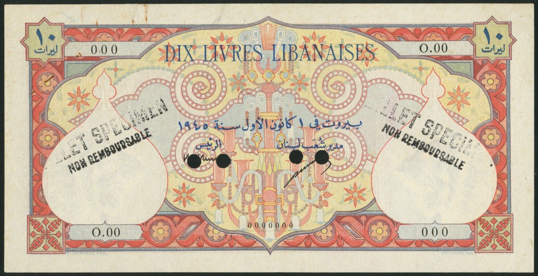 Banque de Syrie et du Liban, Lebanon, specimen 10 livres, 1945, zero serial numbers, red and multicoloured, chandelier and ornate background detail, Berard and Laferriere signatures, reverse red and multicoloured, courtyard at right