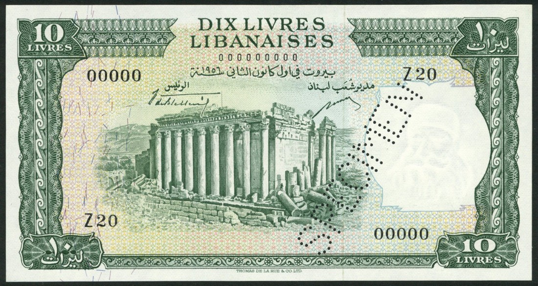(x) Banque de Syrie et du Liban, specimen 10 livres, 1956, zero serial numbers, dark and light green and pale pink, ruins of the Temple of Bacchus at right, diagonal perforated SPECIMEN at right, reverse, shoreline and hillside city scene,