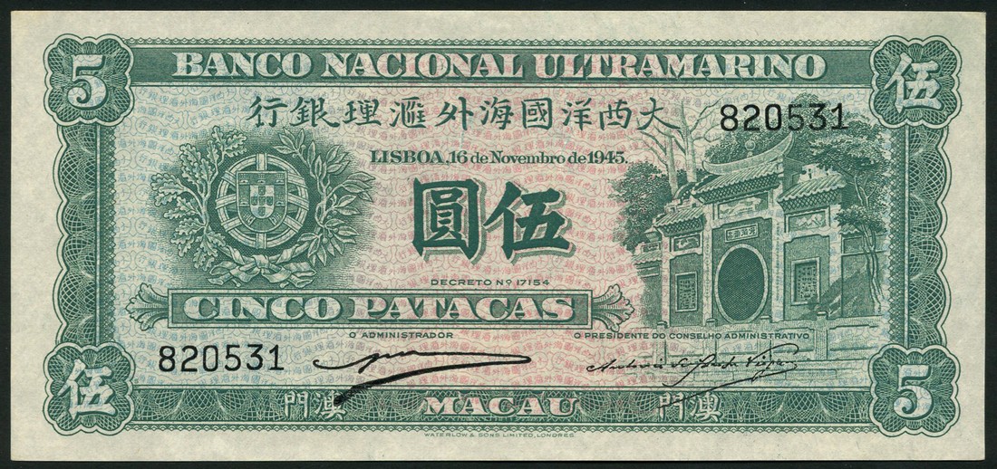 Banco Nacional Ultramarino, Macau, 5 patacas, 1945, serial number 820531, green and pink, gateway at right, arms at left, reverse green, ship seal at centre