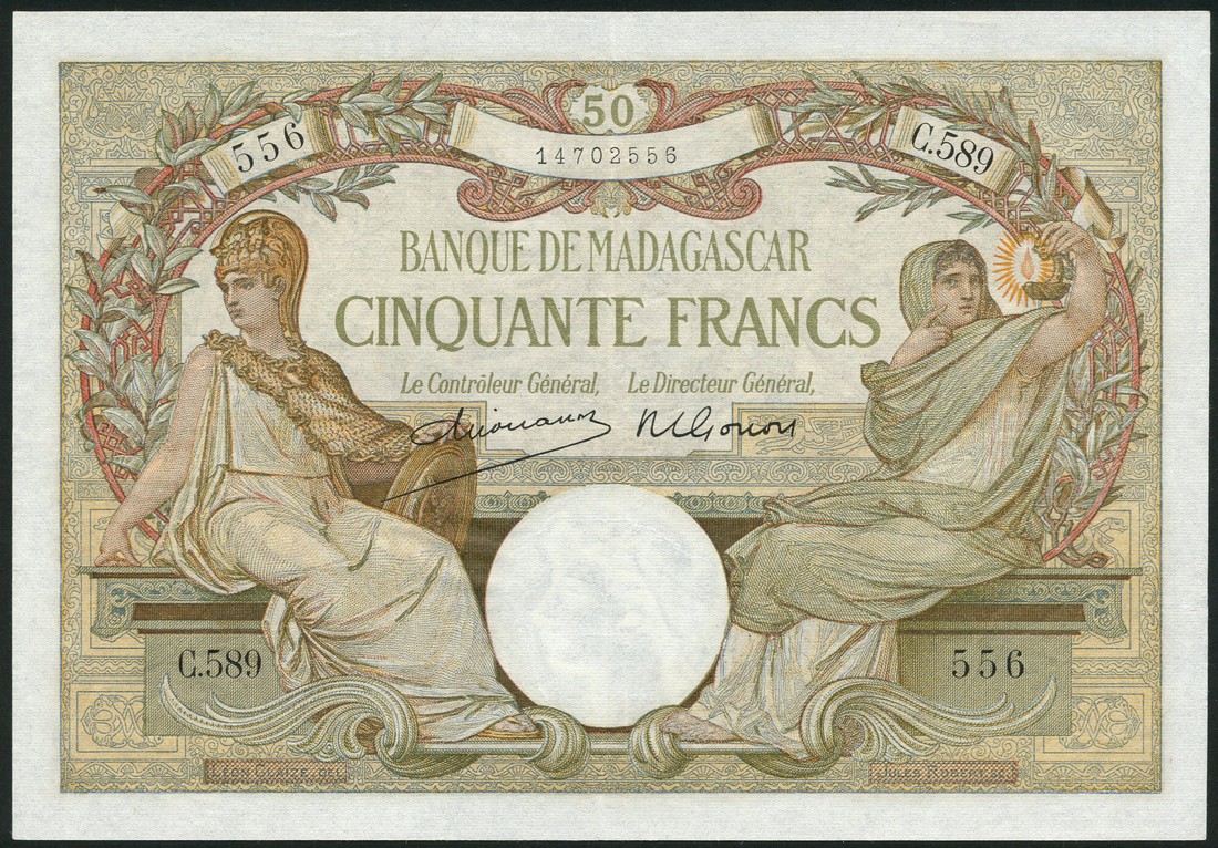 Banque de Madagascar, a group of notes comprising 5 francs, ND (1937-47), 10 francs ND (intro 1948), 20 francs, ND (1937-47), 50 francs, ND (intro 1948),100 francs, ND (intro 1948), a very pleasant group