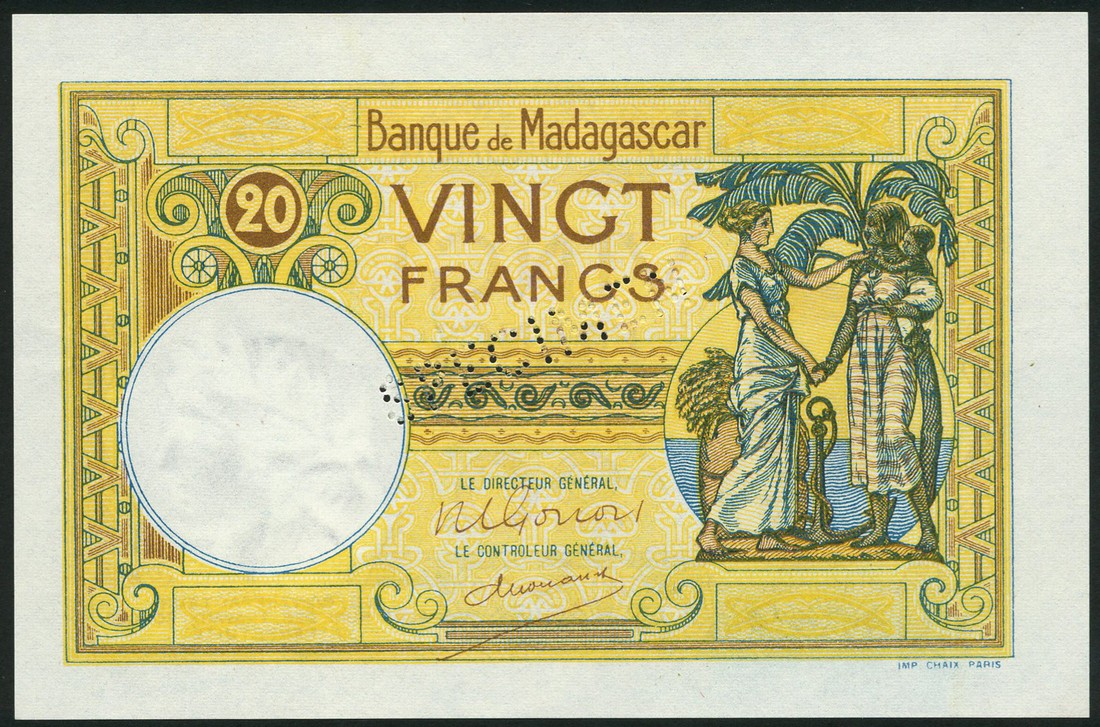 Banque de Madagascar, specimen 20 francs, ND (1948), no serial number, yellow, brown, green and blue, white woman representing France holding hands with Malagasy woman holding infant, reverse Malagasy man, diagonal perforated SPECIMEN centre