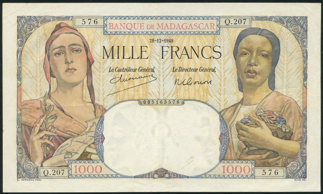 Banque de Madagascar, 1000 francs, 28 December 1948, serial number Q.207 576 multicoloured, two women on obverse, one representing France and one representing Madagascar, reverse seated woman with baskets, thatched village huts and steamship at centre, standing boy with shovel, watermarked