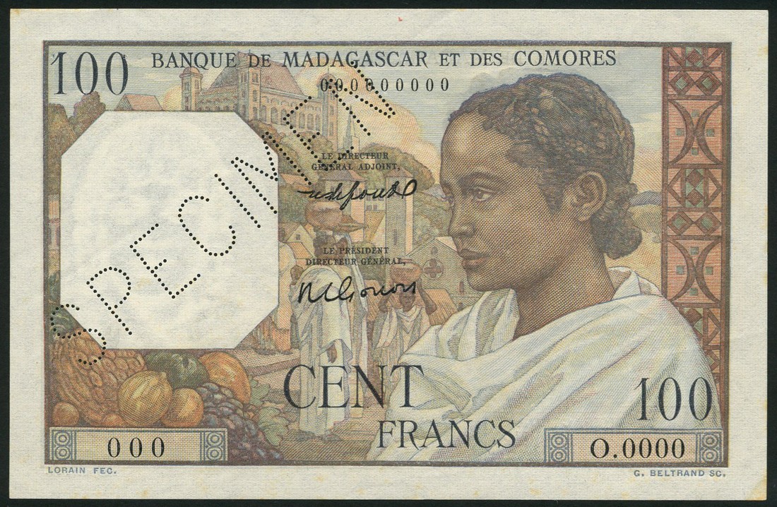 Banque de Madagascar et des Comores, specimen 50 and 100 francs, ND (intro 1951), zero serial numbers, both diagonal perforated SPECIMEN at left, multicolour, flowers, Betsileo woman at right, reverse Betsileo man at centre, multicolour, palace centre background, woman at right, reverse, woman at left, sailing ships centre and zebu cattle at right,