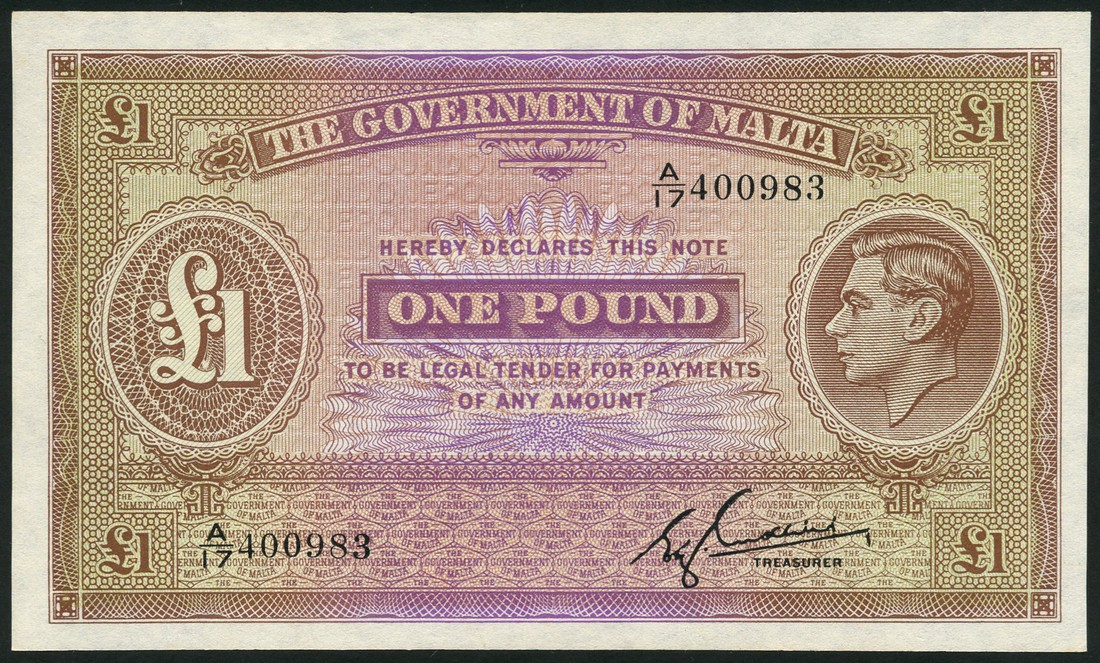 The Government of Malta, £1, ND (1940), serial number A/17400983, brown and violet, uniface, King George VI at right, Edgar Cuschieri signature with printed "TREASURER" at lower right