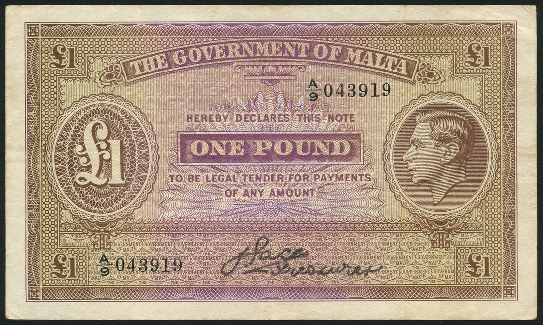 The Government of Malta, £1, ND (1940), serial number A/9043919, £1, ND (1940), serial number A/16211705, uniface, brown, violet and olive green, King George VI at right