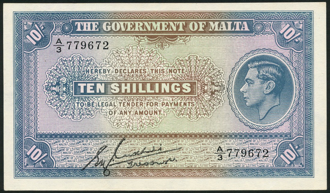 (x) Government of Malta, 10/-, ND (1951), serial number A/1 013631, green, George VI at right, George Cross at left, also 10/-, ND (1940), George V in profile at right