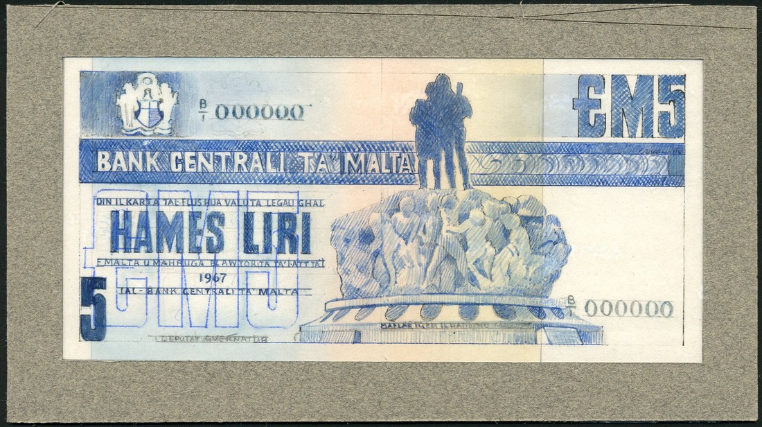 (†) Bank Centrali ta' Malta, obverse artwork on card for a 5 Liri, Law of 1967 (c1973), serial number B/1 000000, space for signature of Deputy Governor at lower left, blue on multicoloured underprint, Workers' Monument at centre, arms at top left, value at lower left and upper right