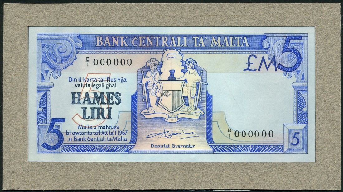 (†) Bank Centrali ta' Malta, obverse composite essay and artwork on card for a 5 Liri, Law of 1967 (c1973), serial number B/1 000000, signature of Deputy Governor at lower centre, blue on multicoloured underprint, arms at centre, ornate scrolls at upper left and right, value at lower left and upper right