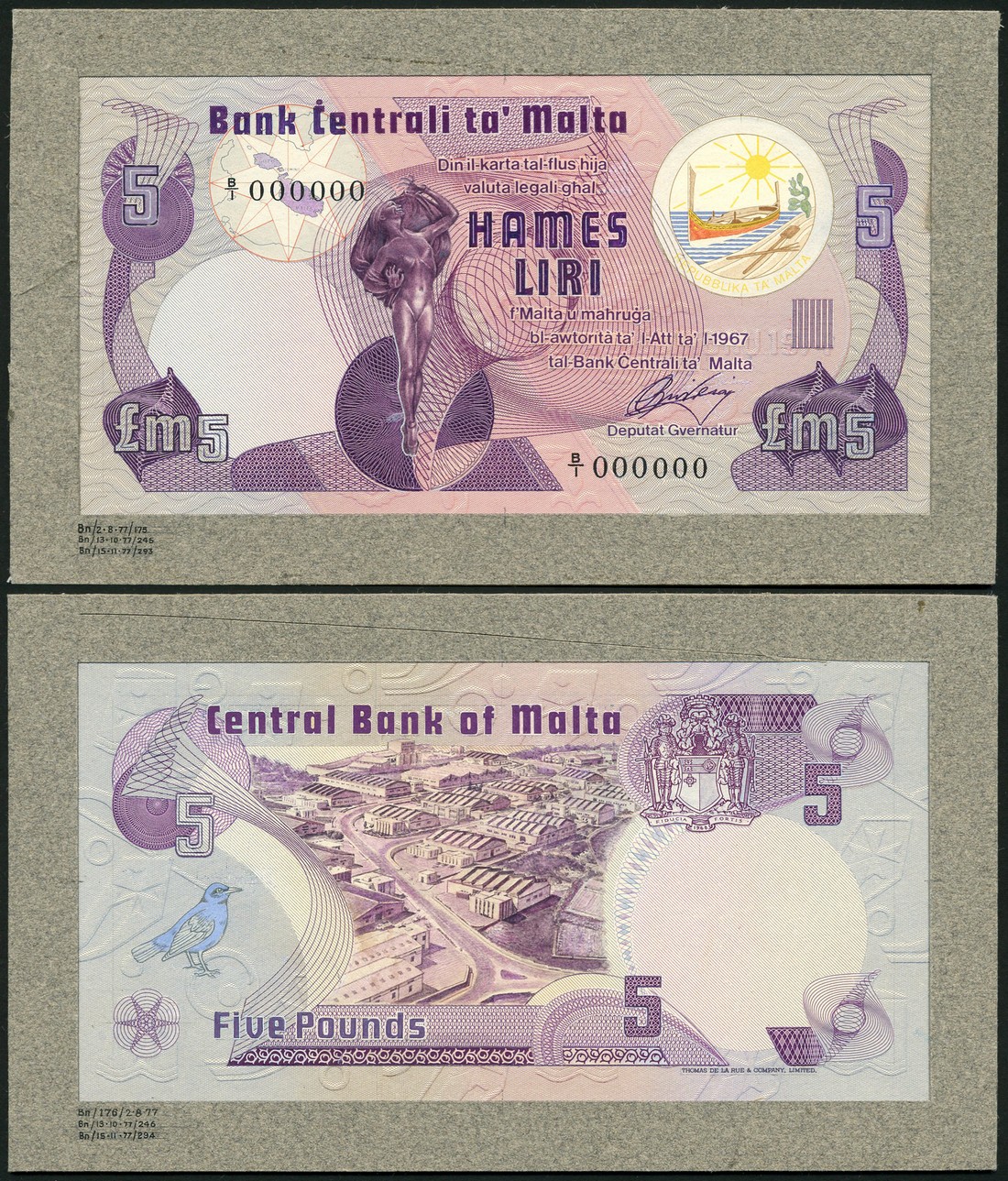 (†) Bank Centrali ta' Malta, obverse and reverse composite essay on card for 5 Liri, Law of 1967 (1977), serial number B/1 000000, purple and violet on multicoloured underprint, Statue of Culture at centre, map at upper left, gondola in circle at upper right, value in each corner, reverse aerial view of Marsa Industrial Estate at left centre, arms at upper right, bird at lower left