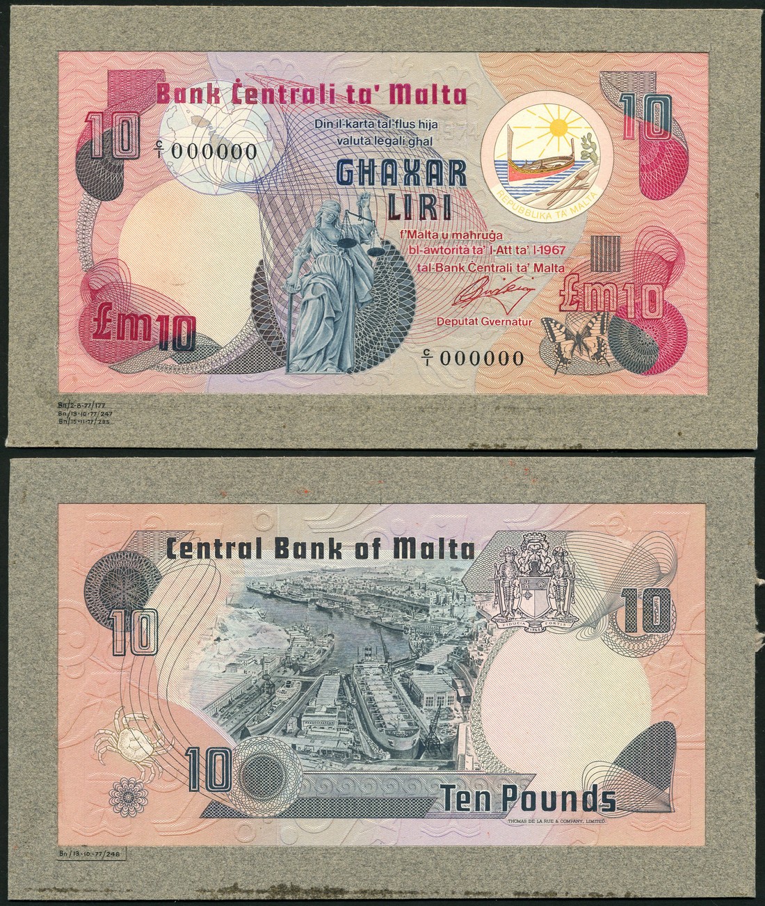 (†) Bank Centrali ta' Malta, obverse and reverse composite essay on card for 10 Liri, Law of 1967 (1977), serial number C/1 000000, grey and carmine on multicoloured underprint, Statue of Justice at centre, map at upper left, gondola in circle at upper right, value in each corner, reverse aerial view of Malta dry docks at centre, arms at upper right, crab at lower left