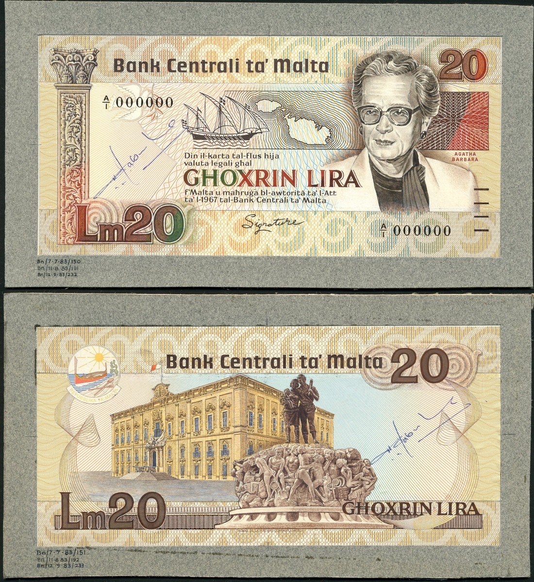 (†) Central Bank of Malta, obverse and reverse composite essay on card for a 20 Liri, Law of 1967, (July 1983), brown and red-brown on multicoloured underprint, serial number A/1 000000, space for signature at lower centre, portrait of Agatha Barbara at right, sailing ship and map at upper centre, dove at upper left, four horizontal lines for the blind at lower right, reverse Auberge de Castille at left, Workers' Monument at centre, gondola in circle at upper left, value at lower left and upper right