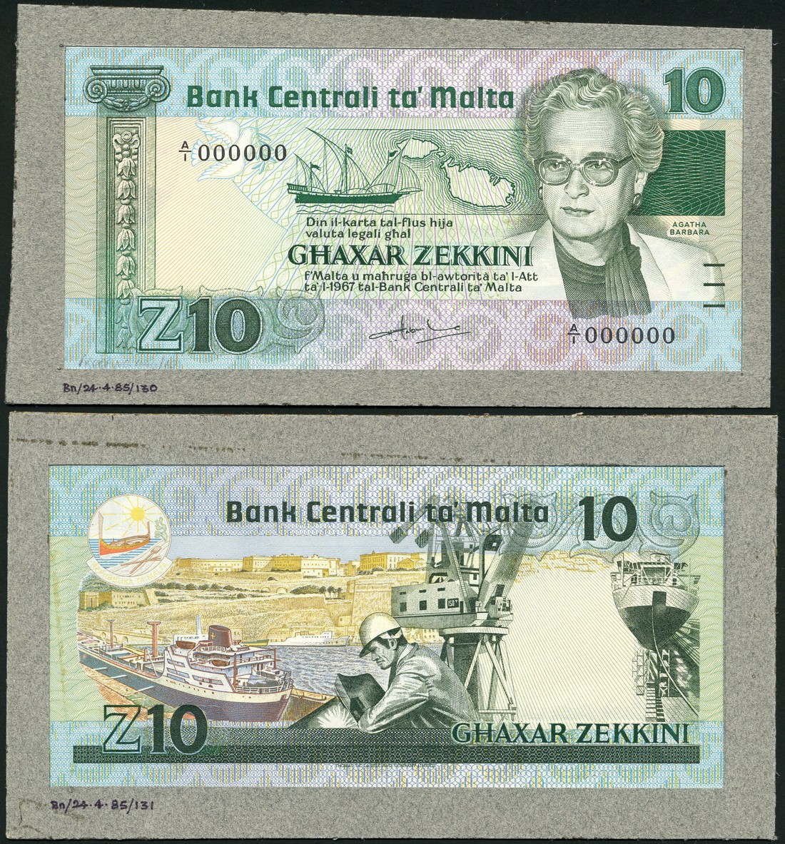 (†) Bank Centrali ta' Malta, obverse and reverse composite essay on card for a 10 Zekkini, Law of 1967 (1985), serial number A/1 000000, signature at lower centre, green on multicoloured underprint, portrait of Agatha Barbara at right, sailing ship and map at upper centre, dove at upper left, three horizontal lines for the blind at lower right, reverse ship in harbour at left, gondola in circle at top left, one man shipbuilding and crane at centre, ship in dry dock at right, value 'Z10' at lower left and figure '10' at upper right