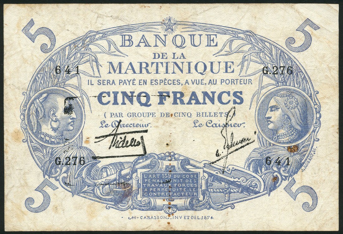 (x) Banque de la Martinique, 5 francs, Law of 1874 (1935), serial number G.276 641, blue, man at left, woman at right, Didelot and Rosemain signatures