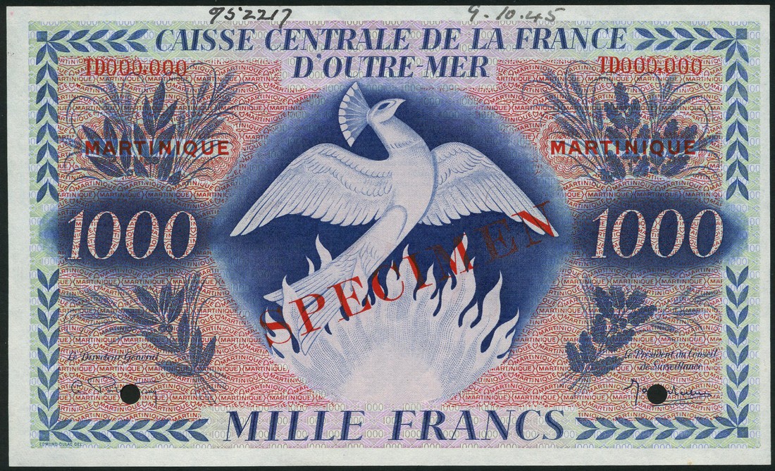 (†) Caisse Centrale de la France d'Outre-Mer, Martinique, specimen 1000 francs, ND (1946), red serial number TD 000000, blue and pale red, phoenix arising from the flames at centre, MARTINIQUE in red at left and right, Postel-Vinay and LeClerc signatures, reverse blue, allegorical scenes of war and peace at left and right