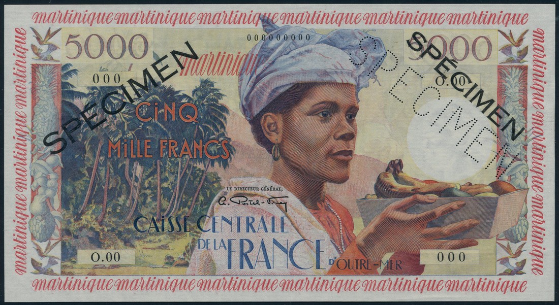 (x) Caisse Centrale de la France d'Outre-Mer, Martinique, specimen 5000 francs, ND (1956), zero serial number, multicolour, palm trees at right, woman with fruit bowl at centre, Postel-Vinay signature low centre, red MARTINIQUE in field, reverse harvesting scenes, diagonal black stamp SPECIMEN top right and left obverse and reverse, perforated diagonal SPECIMEN top right