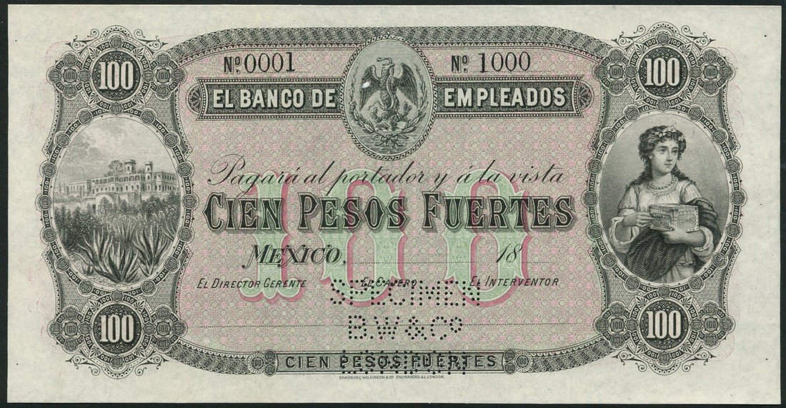 (†) El Banco de Empleados, Distrito Federal-Mexico City, specimen 100 pesos fuertes, Mexico, 18-, serial number 0001-1000, black and pale green and pink, palace at left, maiden with strongbox at right, arms top centre, reverse pink and green, value in field