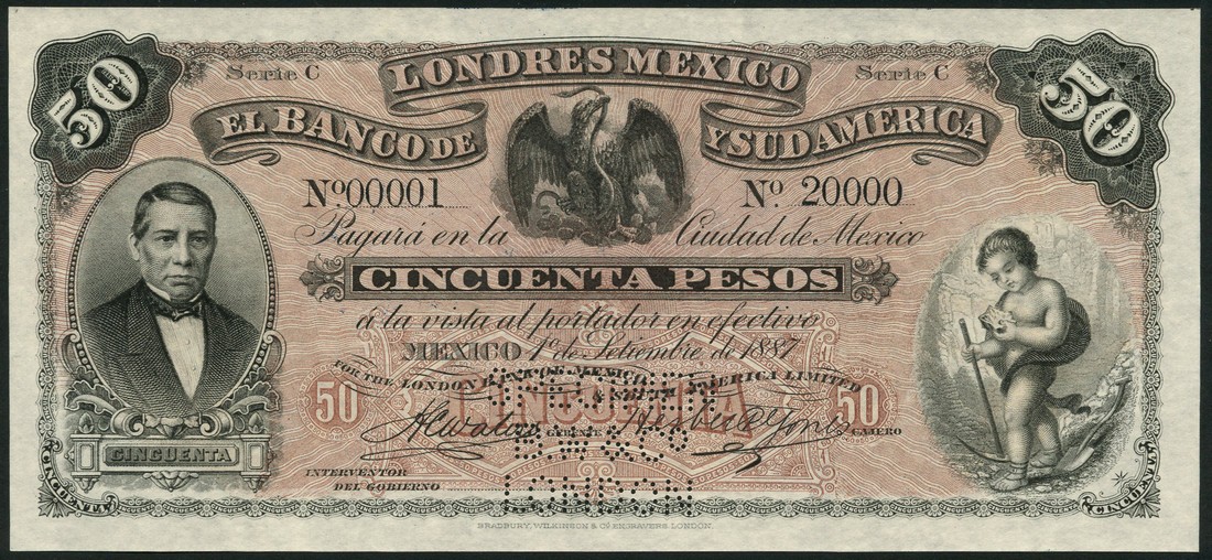 (†) El Banco de Londres Mexico y Sud America, specimen 50 pesos, Mexico, 1 September 1887, serial number 00001-20000, series C, brown and black, eagle top centre, Pablo Benito Juarez at left, mining cherub with pickaxe and nugget at right, value top left and right, reverse purple-brown, palace at centre in oval frame, value at left and right