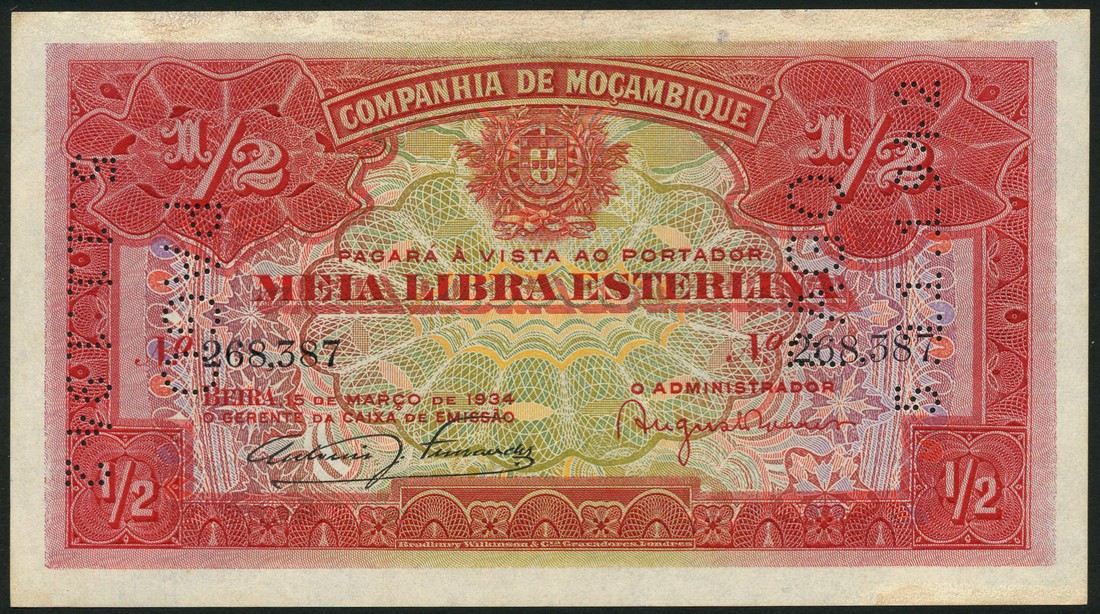 Banco Nacional Ultramarino, Mozambique, a collection of notes consisting of 5 escudos, 1 January 1921, serial number A716,091, Companhia de Mocambique, Beira, specimen 1/2 libra, 15 March 1934, specimen 1 escudo, 1 September 1941, no serial number, specimen 20 escudos, 1 November 1941, 50 escudos, 1 November 1941, serial number 437,606, 1000 escudos,16 May 1972, serial number 089815