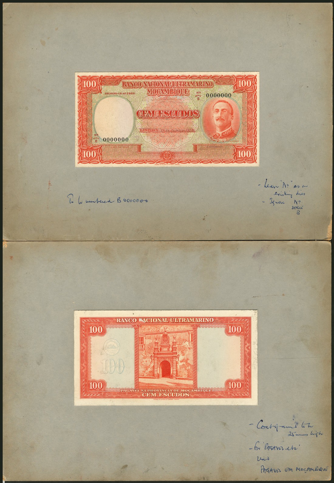 (†) Banco Nacional Ultramarino Mocambique, an obverse and reverse composite essay on large format grey board, 295 x 214mm, for a 100 Escudos, 24 July 1958, serial number 0000000, orange-red on multicoloured underprint, portrait of Aires Ornelas at right, value in each corner, reverse, ornate church doorway at centre, incorrect size steamship seal and value at left, incorrect 'NA PROVINCIA' at lower centre, ink annotations on both cards