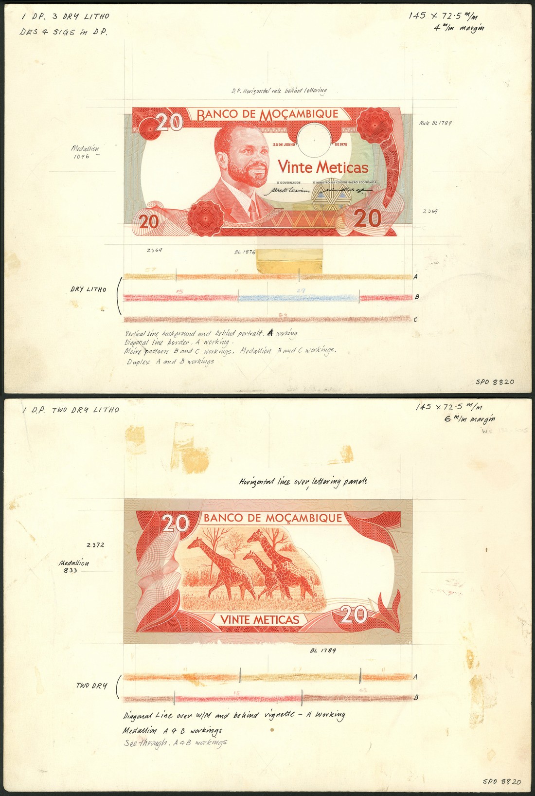 (†) Banco de Mocambique, an obverse and reverse composite essay on large format card, 266 x 197mm, for a 20 Meticas, 25 June 1975, two signature overlays, scarlet and multicoloured, President Samora Moises Machel at centre left, value in three corners, geometric patterns at lower left and lower right, reverse giraffes, geometric patterns with leaves at left and right, annotations and hand drawn colour bars on both cards