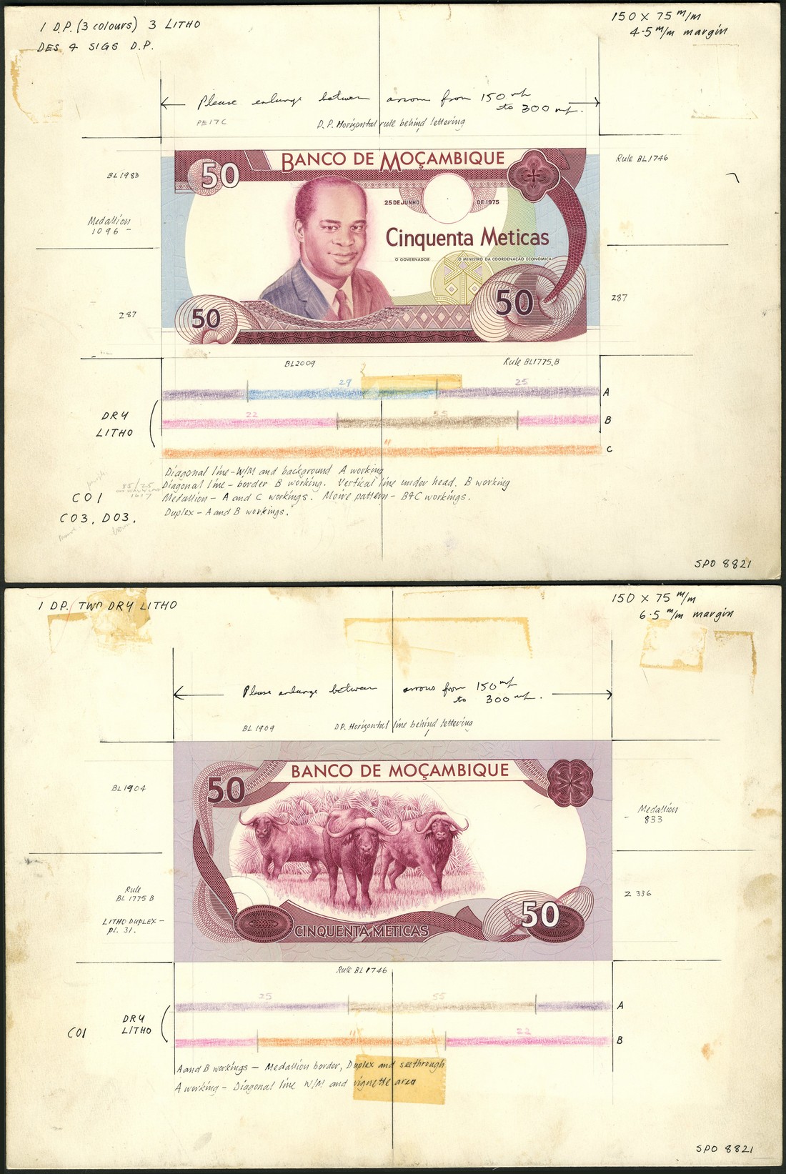 (†) Banco de Mocambique, an obverse and reverse composite essay on large format card, 266 x 197mm, for a 50 Meticas, 25 June 1975, purple and multicoloured, Eduardo Mondlane at centre left, value in three corners, geometric patterns at lower left and lower right, reverse Cape buffalo, geometric patterns at left and lower right, annotations and hand drawn colour bars on both cards
