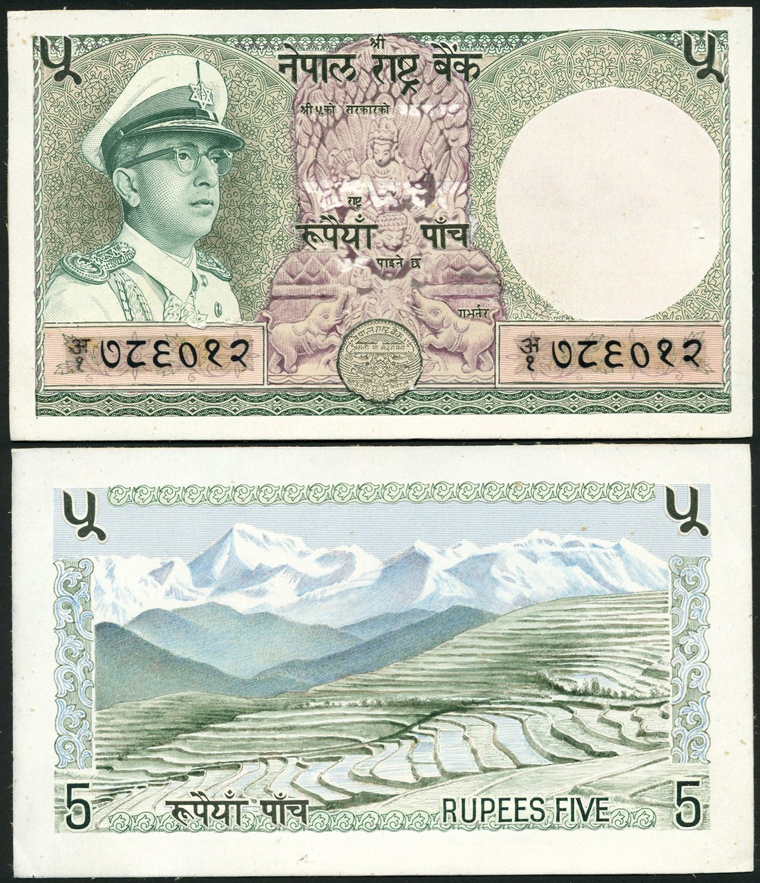 (†) Central Bank of Nepal, obverse and reverse composite essay on card, 5 Rupees, ND (c1972), dark green, pale green and lilac on yellow underprint, King Mahendra Vira Vikrama wearing military uniform at left, temple carving at centre, reverse green and blue-grey, terraced hillside with Himalayas in background