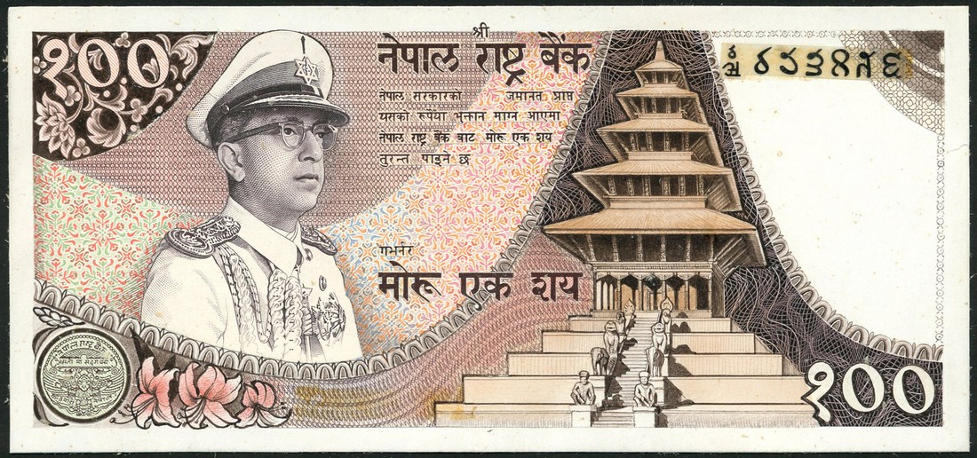 (†) Central Bank of Nepal, obverse composite essay on card for a 100 Rupees, ND (c1972), brown, pink and multicoloured, King Mahendra Vira Vikrama wearing military uniform at left, temple staircase at centre, value at upper left and lower right