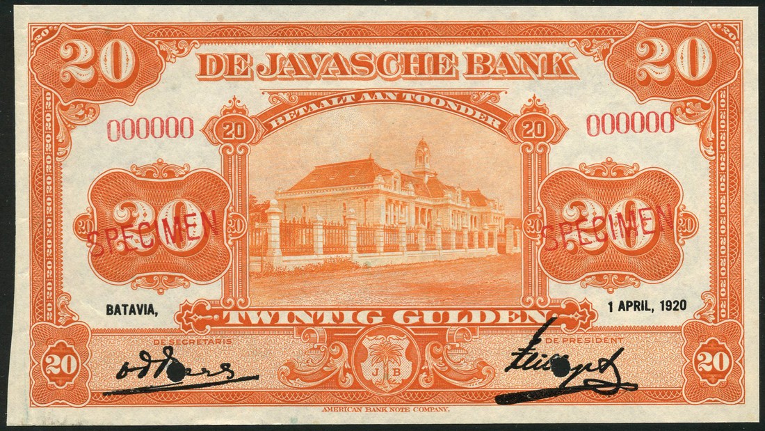 (x) De Javasche Bank, Netherlands East Indies, specimen 20 gulden, 1 April 1920, red zero serial numbers, orange and white, bank building at centre, value at left and right and low centre, two printed signatures, reverse orange, green and blue, value in field