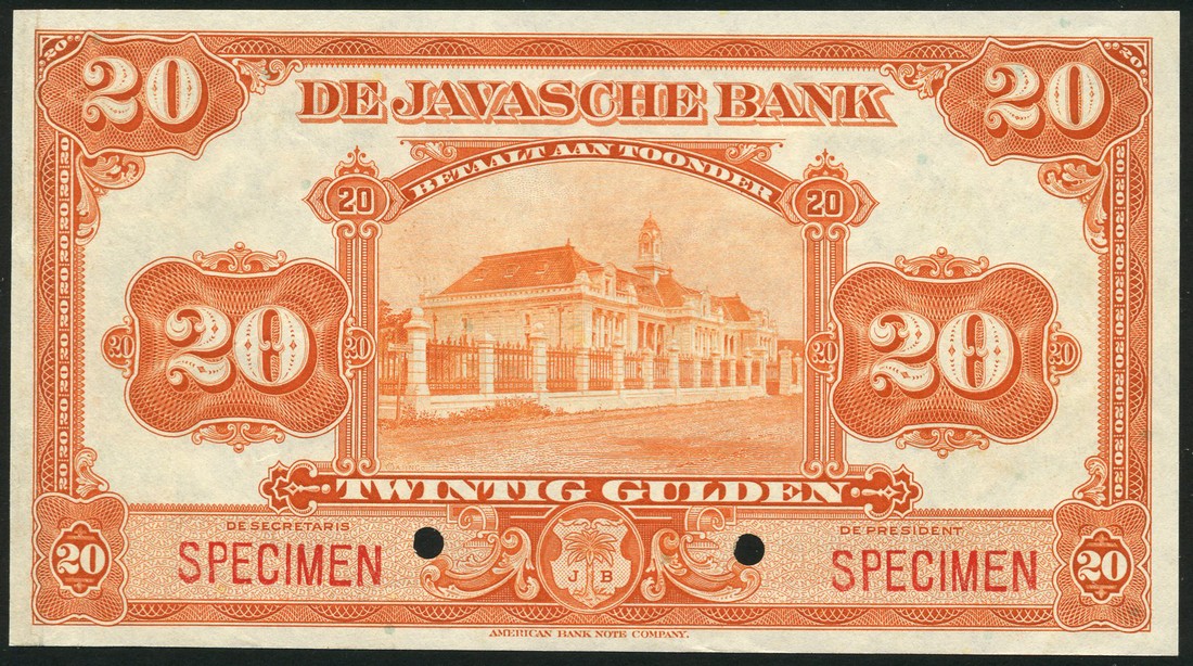 (x) De Javasche Bank, Netherlands East Indies, specimen 20 gulden, 1 April 1920, orange and white, bank building at centre, value at left and right and low centre, reverse orange, green and blue, value in field