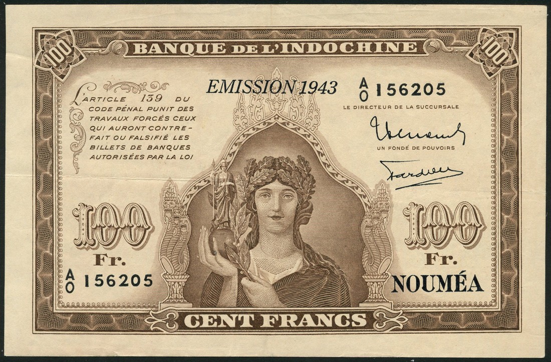 Banque de L'Indochine, New Caledonia, 100 francs, 1943, serial number A0 156205, brown on cream underprint, woman wearing floral headdress holding small figure of Athena at centre, overprint EMISSION 1943 top centre, reverse statue of Angkor