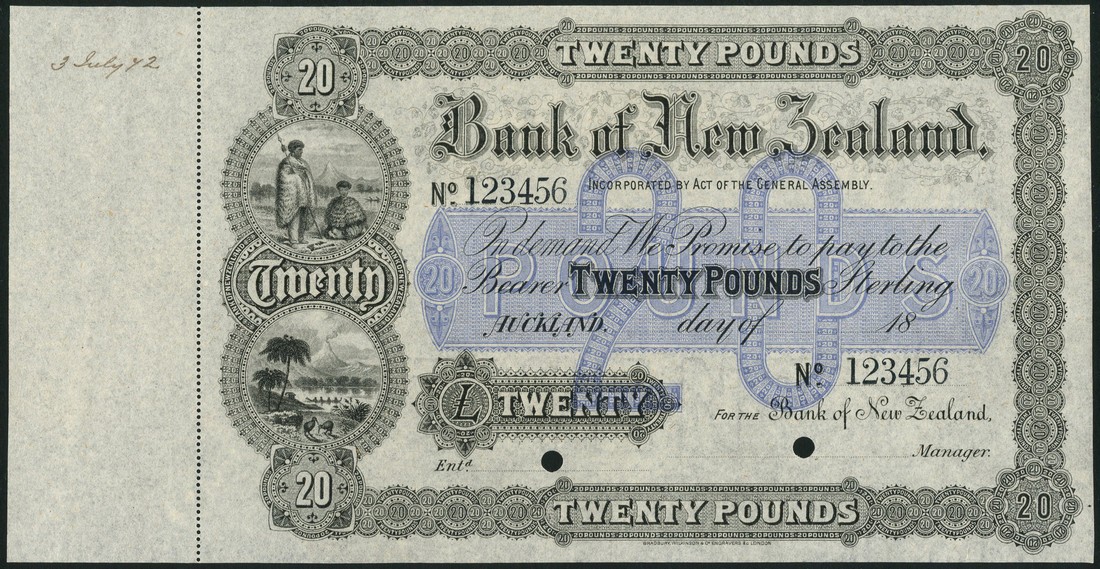 (†) Bank of New Zealand, specimen £20, Auckland, 18-, serial number 288901, blue and white, Maoris and countryside view with volcano and kiwi birds at left, counterfoil at left, reverse blue and white, value at centre