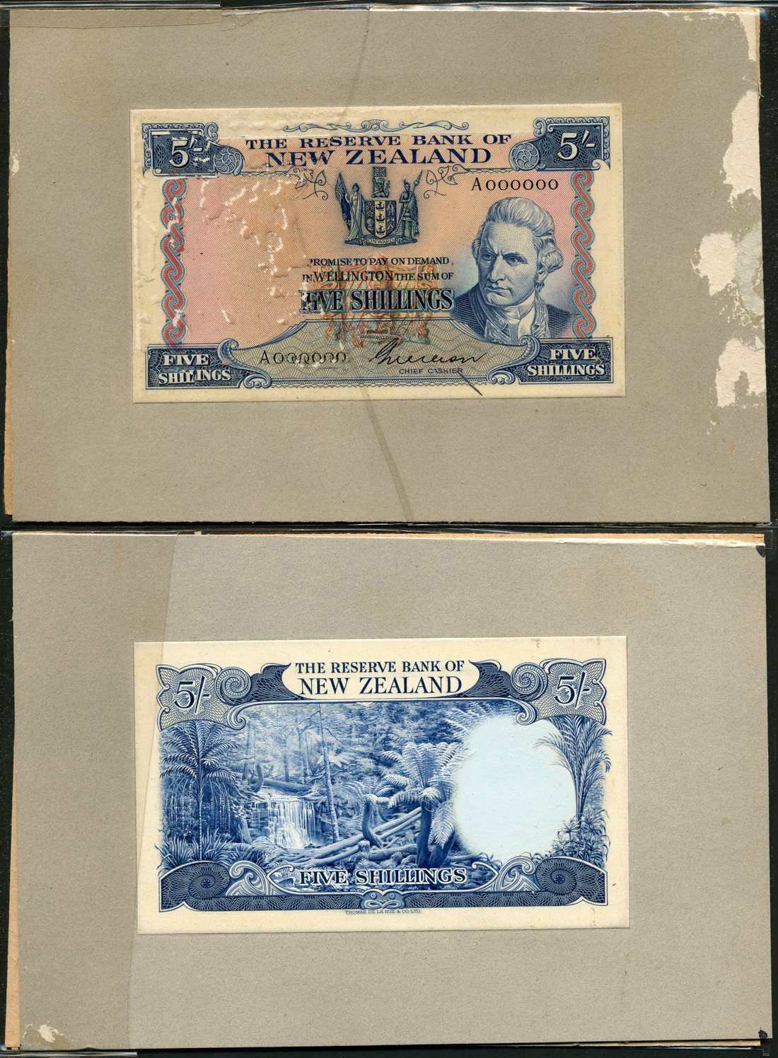 (†) Reserve Bank of New Zealand, an obverse and reverse composite essay on card for a 5 Shillings, ND (ca 1955), serial number A 000000, signature G. Wilson, blue and red on pink underprint, portrait of Captain James Cook at lower right, arms at upper centre, value in each corner, reverse dark blue on pale blue underprint, vignette of rain forest, ferns and waterfall