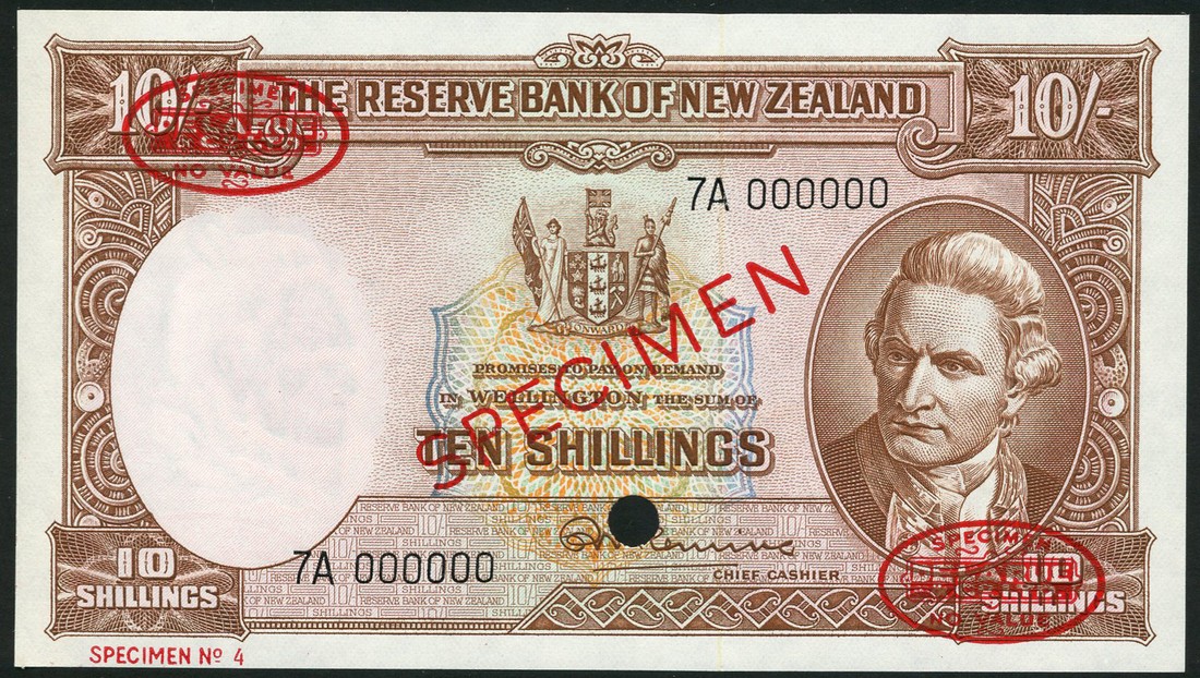 (†) Reserve Bank of New Zealand, specimen 10 Shillings (2), ND (1960-67), serial numbers 7A 000000 and 7J 000000, both signature Fleming, with security thread, brown on multicoloured underprint, Captain James Cook at right, arms at upper centre, reverse signing of the Treaty of Waitangi at centre, kiwi at left, both overprinted SPECIMEN in red, with two De La Rue Specimen ovals on obverse and reverse, one punch hole