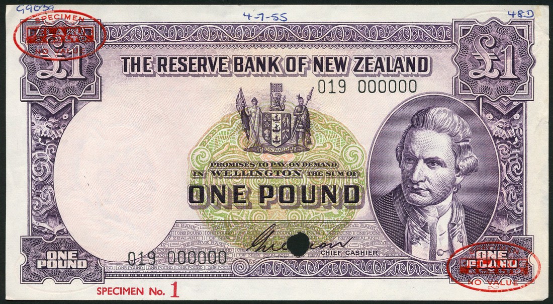 (†) Reserve Bank of New Zealand, specimen £1, ND (1953-56), serial number O19 000000, signature Wilson; also specimen £1 (2), ND (1960-67), serial numbers 227 000000 and 133 000000, both signature Fleming, yellow security thread, all purple on multicoloured underprint, Captain James Cook at right, arms at upper centre, reverse Cook's ship "Endeavour", all overprinted with two red De La Rue Specimen ovals on obverse and reverse, the last two also overprinted SPECIMEN horizontally, one punch hole