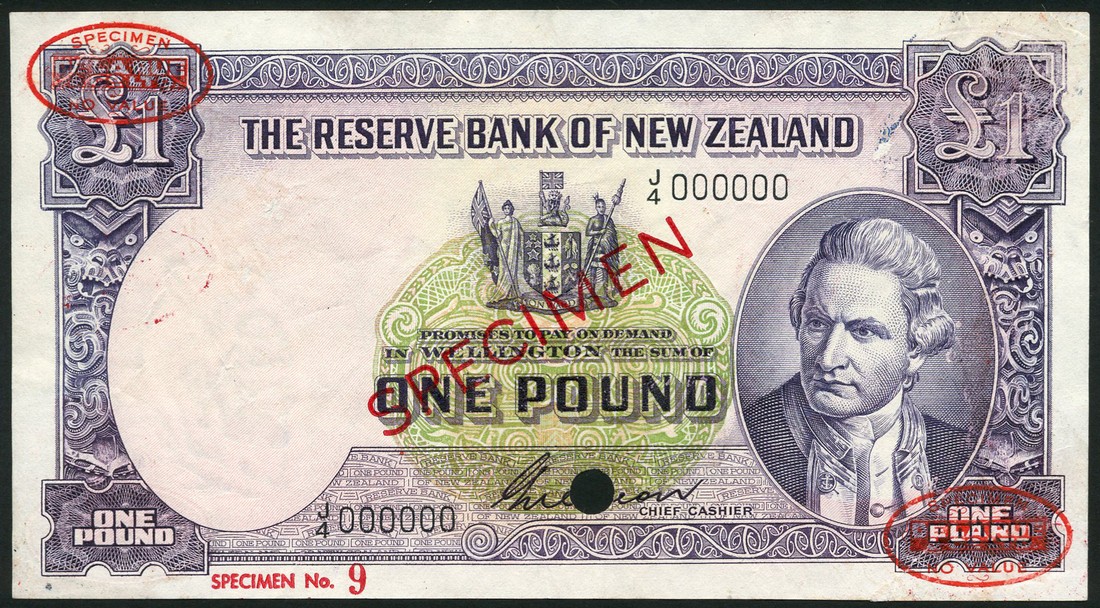 (†) Reserve Bank of New Zealand, specimen £1, ND (1955-56), serial number J/4 000000, signature Wilson, purple on multicoloured underprint, Captain James Cook at right, arms at upper centre, reverse pale blue with a trace of purple at lower left and lower right, Cook's ship "Endeavour", overprinted SPECIMEN in red, with two De La Rue Specimen ovals on obverse and reverse
