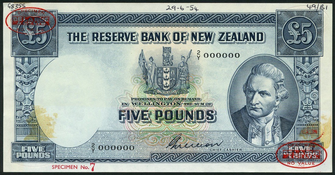 (†) Reserve Bank of New Zealand, specimen £5, ND (1953-56), serial number 2/Y 000000 (small font), signature Wilson, blue on multicoloured underprint, Captain James Cook at right, arms at upper centre, reverse, Lake Pukaki and Mount Cook, overprinted with two red De La Rue Specimen ovals on obverse and reverse,