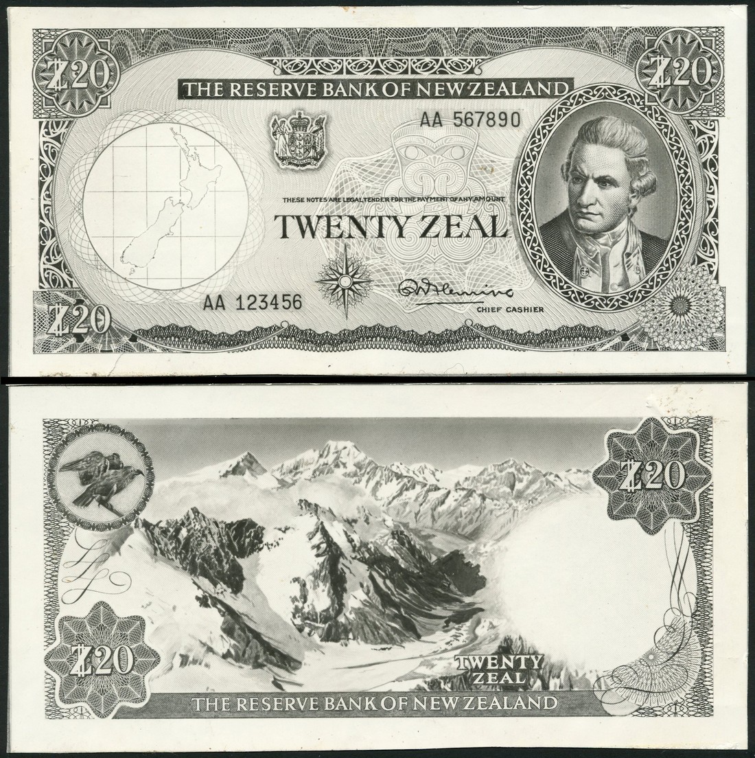 (†) Reserve Bank of New Zealand, a pair of black and white archival photographs showing the obverse and reverse of a 20 zeals, ND (c.1940-67), Captain Cook at right, map at left, value in centre and corners, reverse snow covered mountains, bird at top left