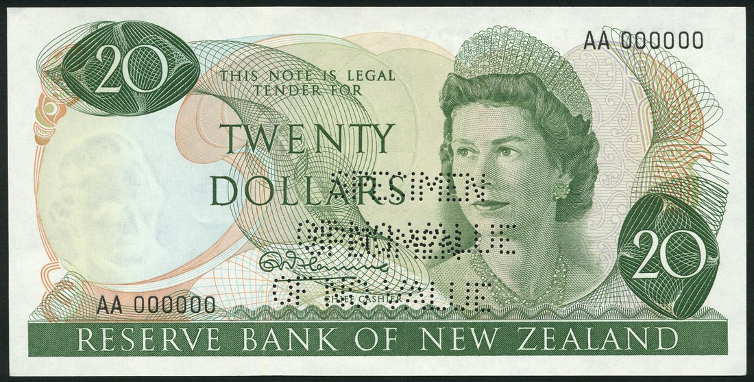 (†) Reserve Bank of New Zealand, specimen $20 (2), ND (1967), both serial number AA 000000, signature Fleming, green on multicoloured underprint, portrait of Queen Elizabeth II at right, reverse miro at left, pigeon at centre, the first perforated SPECIMEN OF NO VALUE, the second overprinted SPECIMEN diagonally in red on obverse and reverse